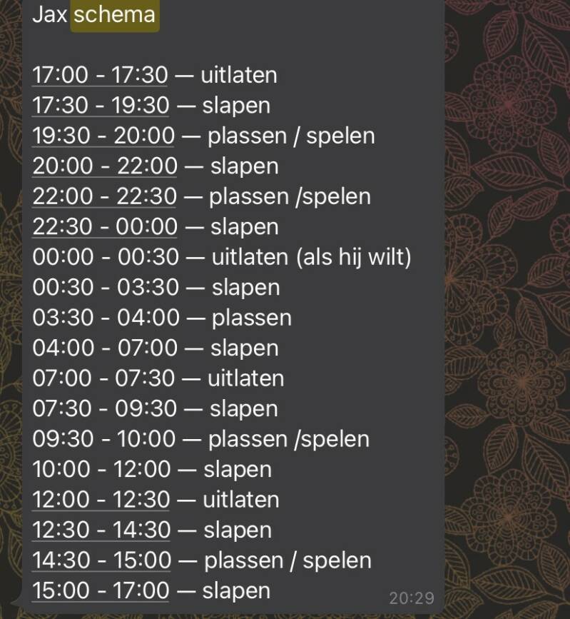 Wij hebben aan het begin een schema gemaakt welke 24 uur doorliep. Dus een schema voor overdag, maar ook voor in de nacht. Dit leek ons sowieso handig, omdat de puppy ook voldoende slaap nodig heeft. Zo maakten wij een schema op welke momenten de puppy eten kreeg, mocht spelen, naar buiten mocht voor een plas/wandeling en wanneer hij terug de bench in moest voor zijn rust. De eerste dagen zorgden wij er voor dat Jax om de twee uur naar buiten kon om een plasje/poep te doen.